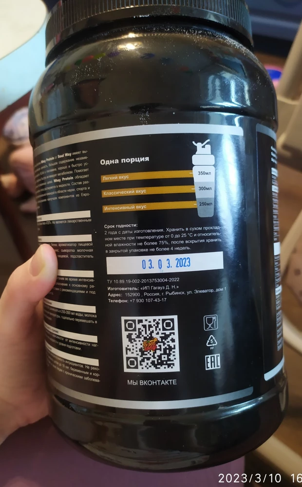 Банка пришла целая и аккуратно запечатанная. Крышка закрыта,мембрана цела. Пока не знаю насчёт качества и результатов использования, это первый купленный мной протеин. Из минусов то,что жила очень сладкая получается. Брала для себя и сына, вот ему нравится,но на мой вкус очень сладко.
