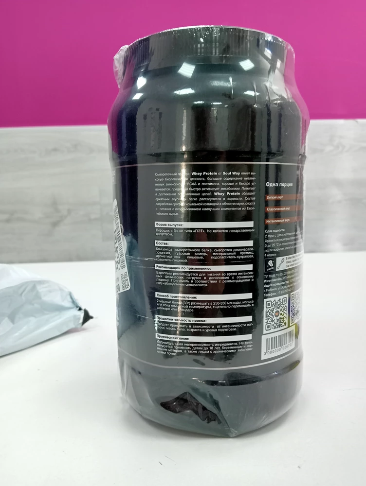 Здравствуйте. Заказали Протеин, товар пришел с опережением от заявленной даты,на сутки. Банка была запечатана в белый, непрозрачный П/Э пакет. Распаковали:банка немного мятая, но целостность не нарушена. Вкус отменный, напоминает вкус Кофейной,жевательной резинки))) Не приторный, приятный. Протеин этой марки заказывали ранее. Ожидания полностью оправданы.