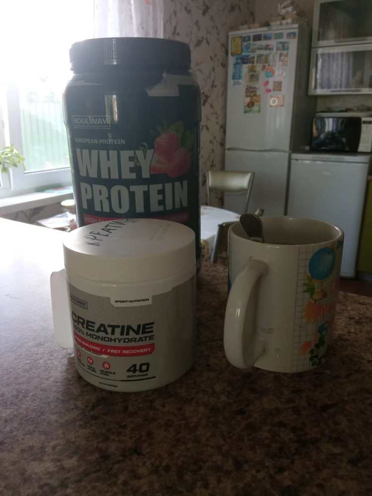 Пришёл быстро, упаковка без дефектов. Креатин не имеет цветы и запаха. Протеин имеет приятный вкус клубники со сливками.